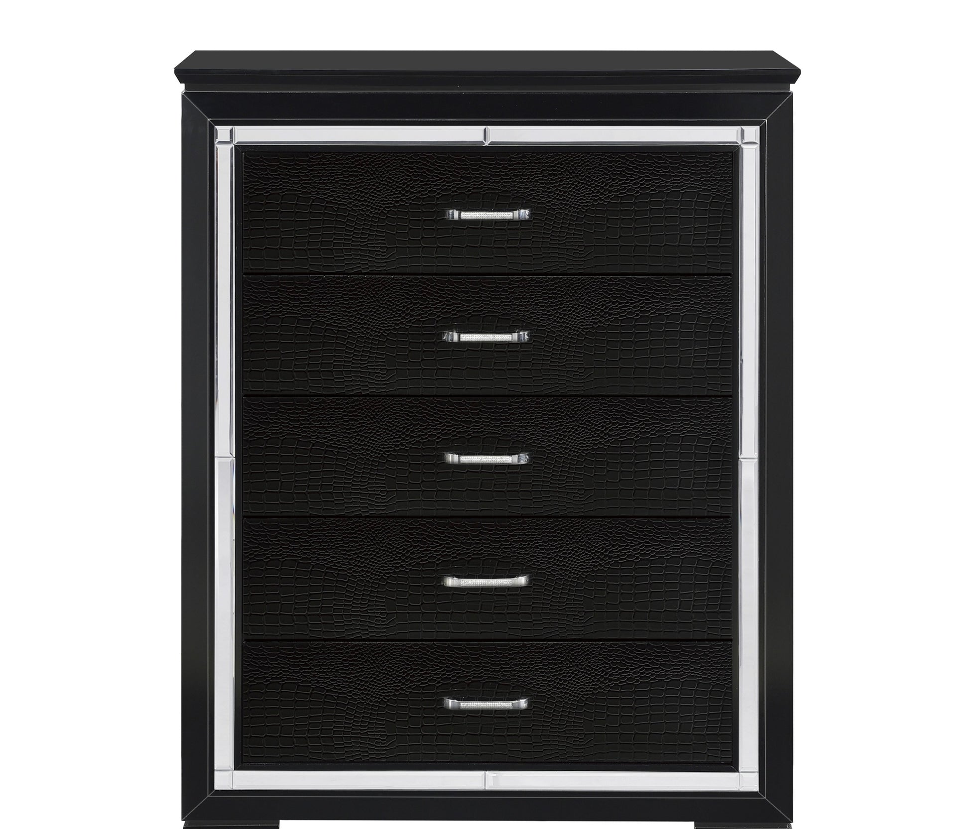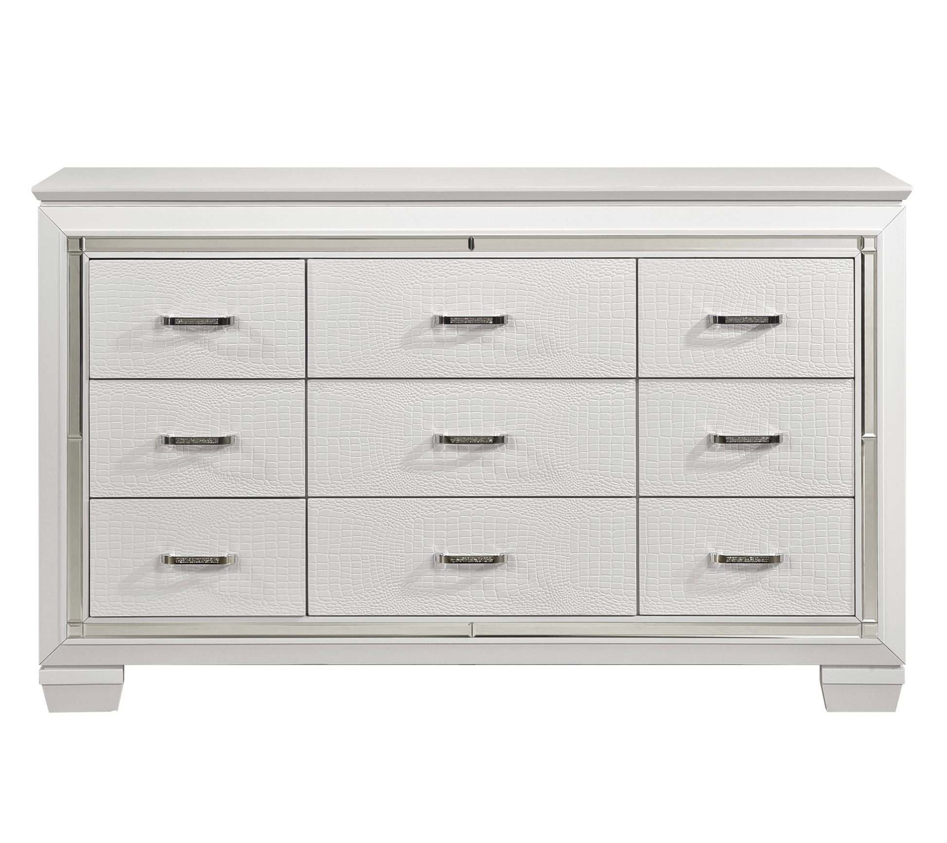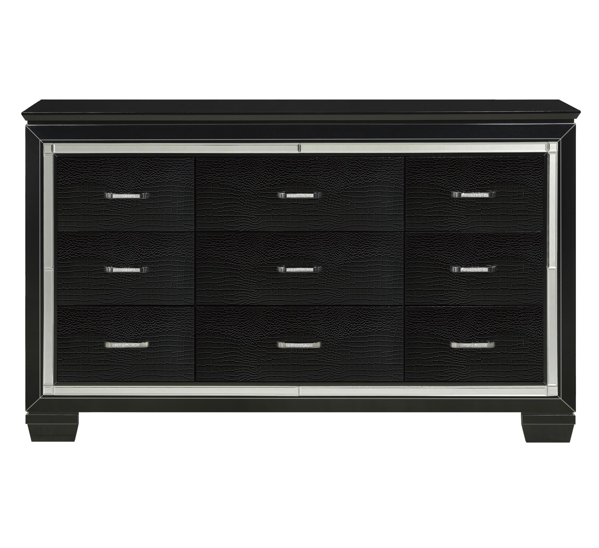 - Faux alligator embossed, textural drawer fronts with beveled mirror trim