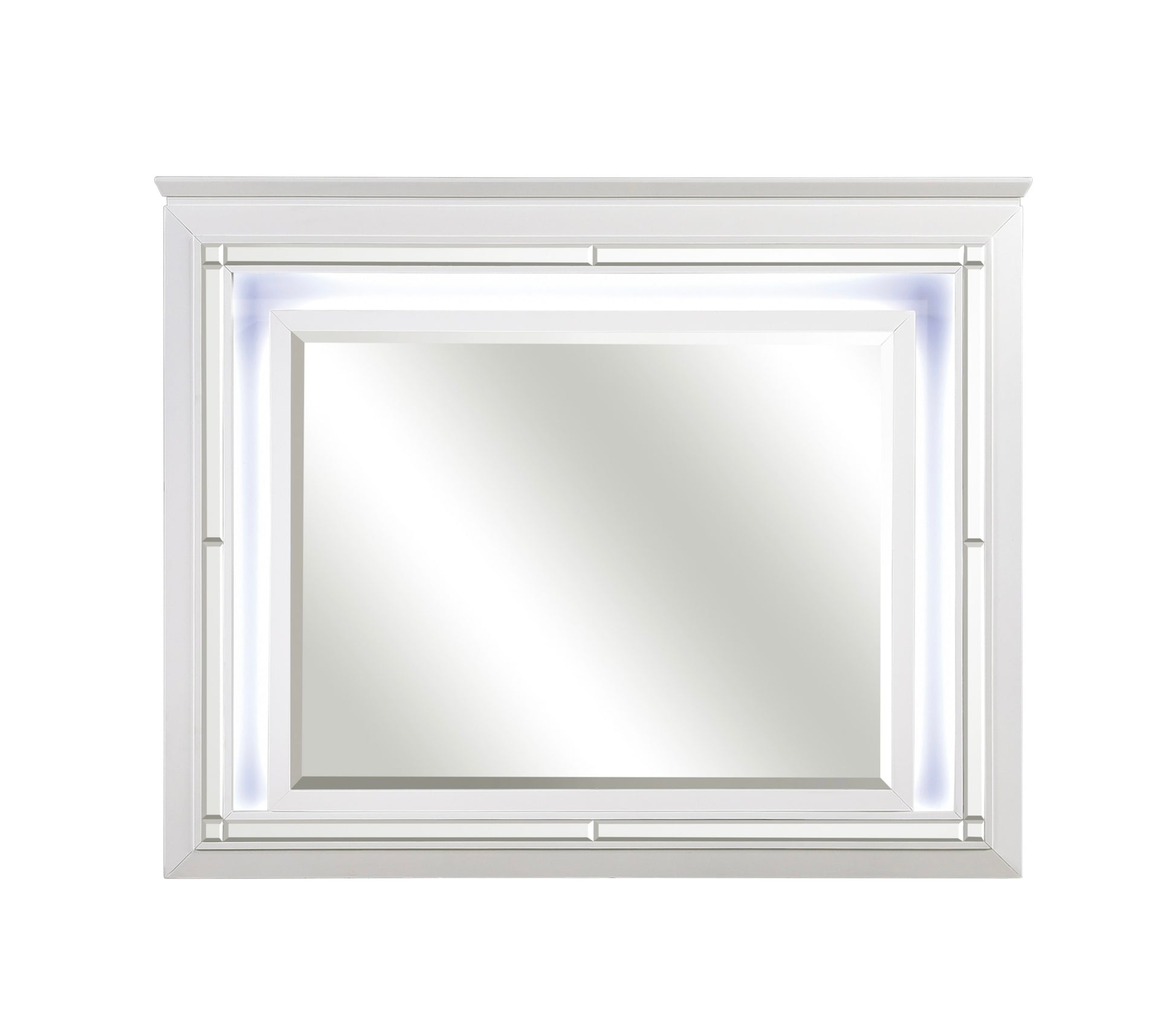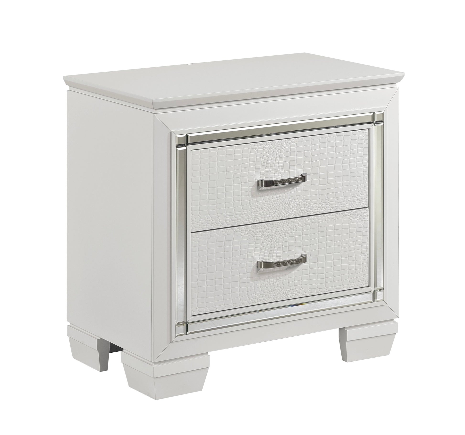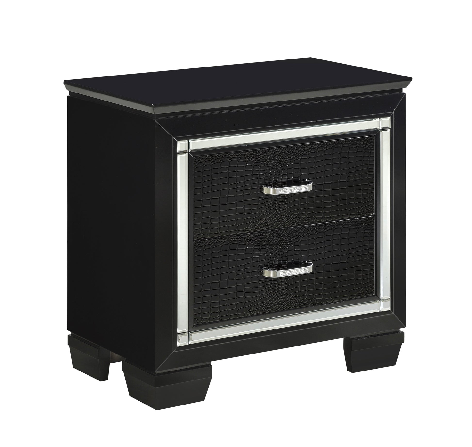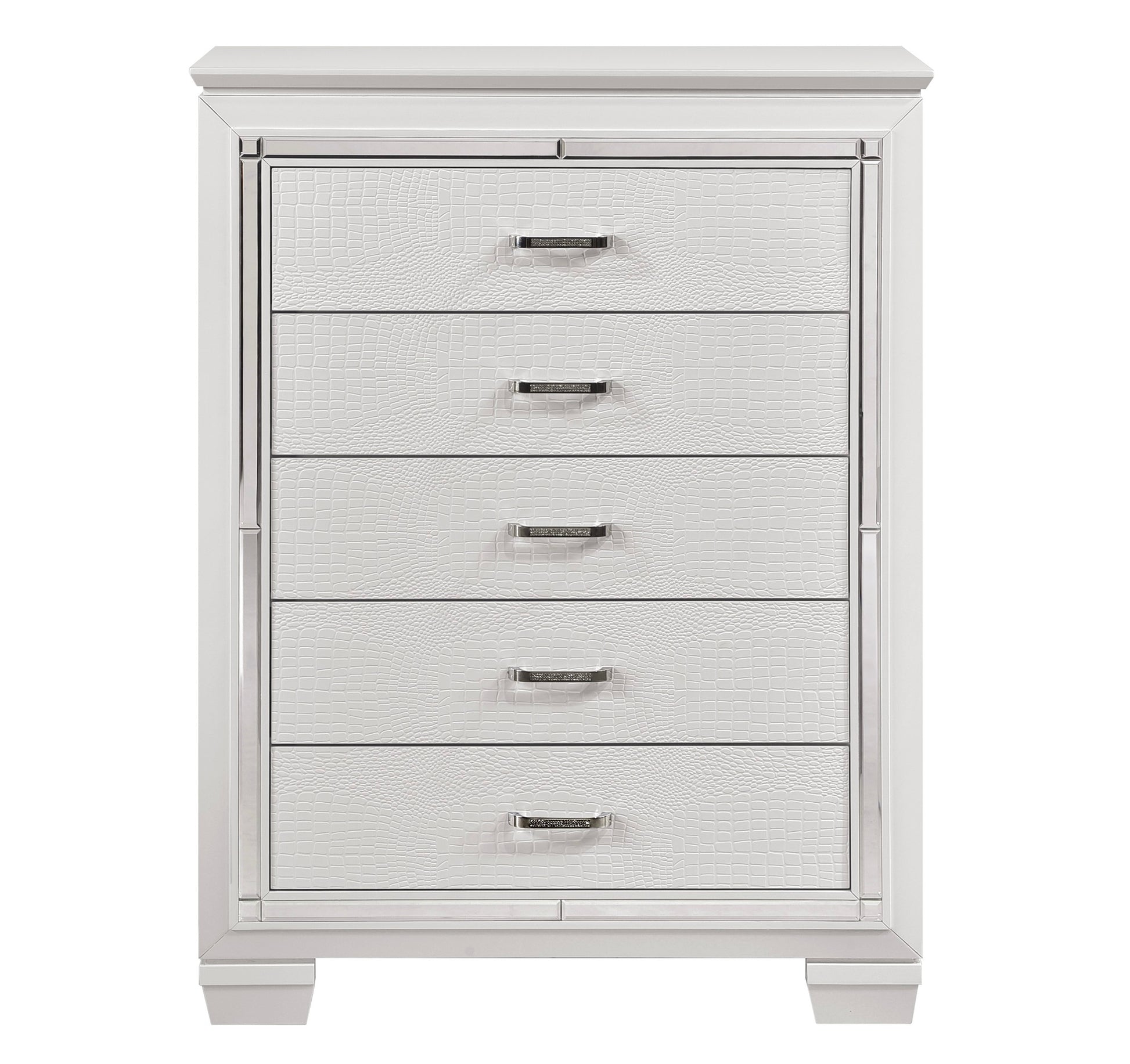 - Faux alligator embossed, textural drawer fronts with beveled mirror trim