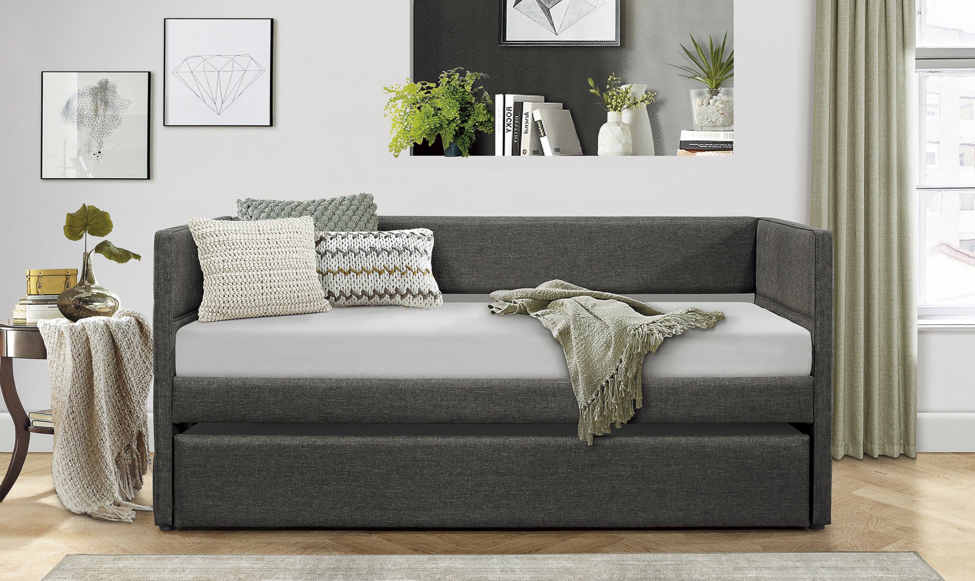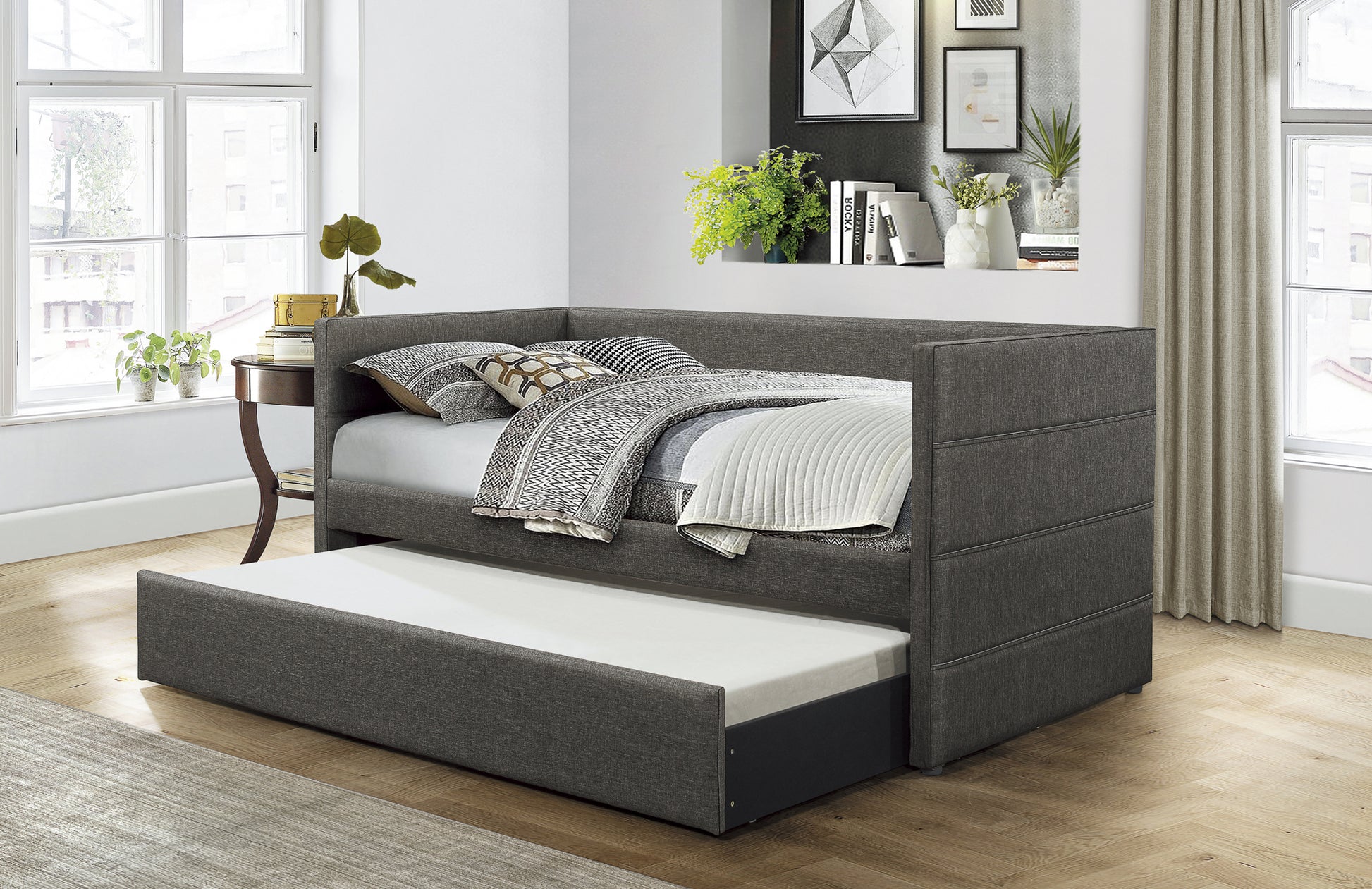 - Pull-out trundle bed with casters